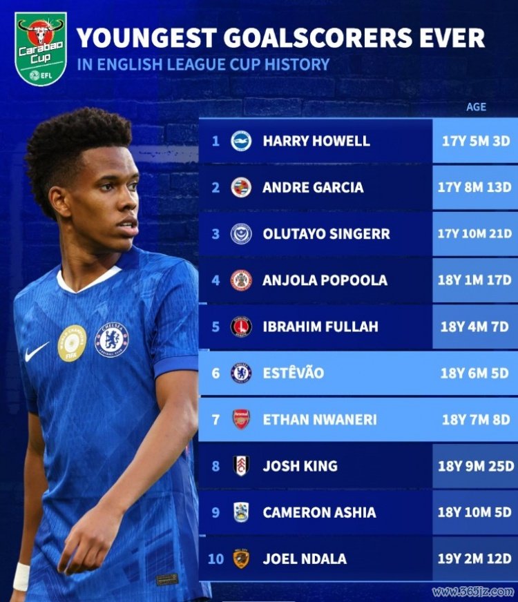 10月30日讯 本轮联赛杯完赛多场,切尔西和阿森纳双双晋级,两队各有1位18岁小将破门。数据统计显现,两东说念主分列联赛杯最年青进球榜第6和第7位。