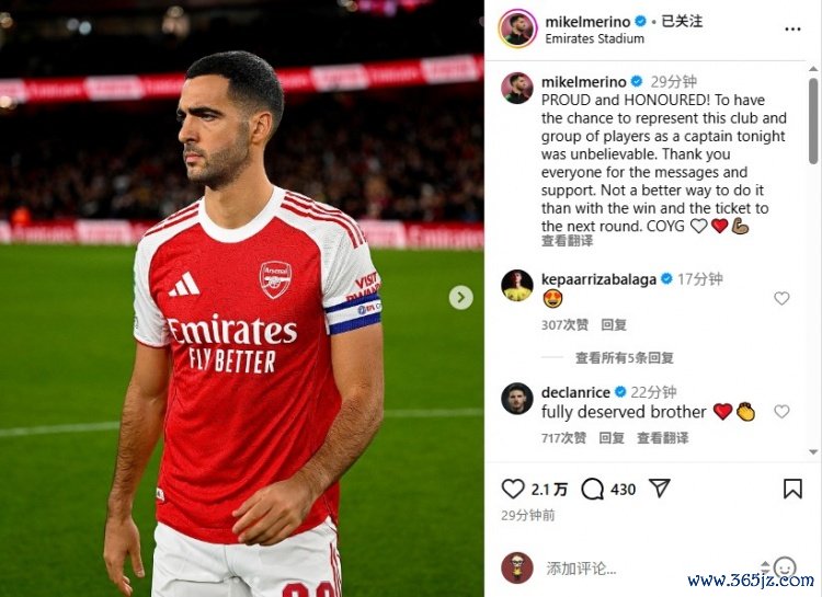 梅里诺写谈:“自爱与运道!今晚能有契机当作队长代表这家俱乐部和这群球员出战,嗅觉难以置信。感谢通盘东谈主的留言和赞助,莫得比用一场到手和晋级下一轮更好的形势来庆祝了,枪手加油!🤍❤️💪🏽”
