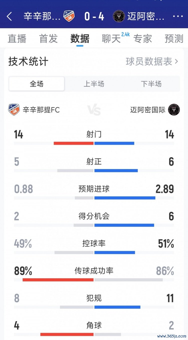 迈阿密国外4-0辛辛那提全场数据:射门14-14,射正6-5