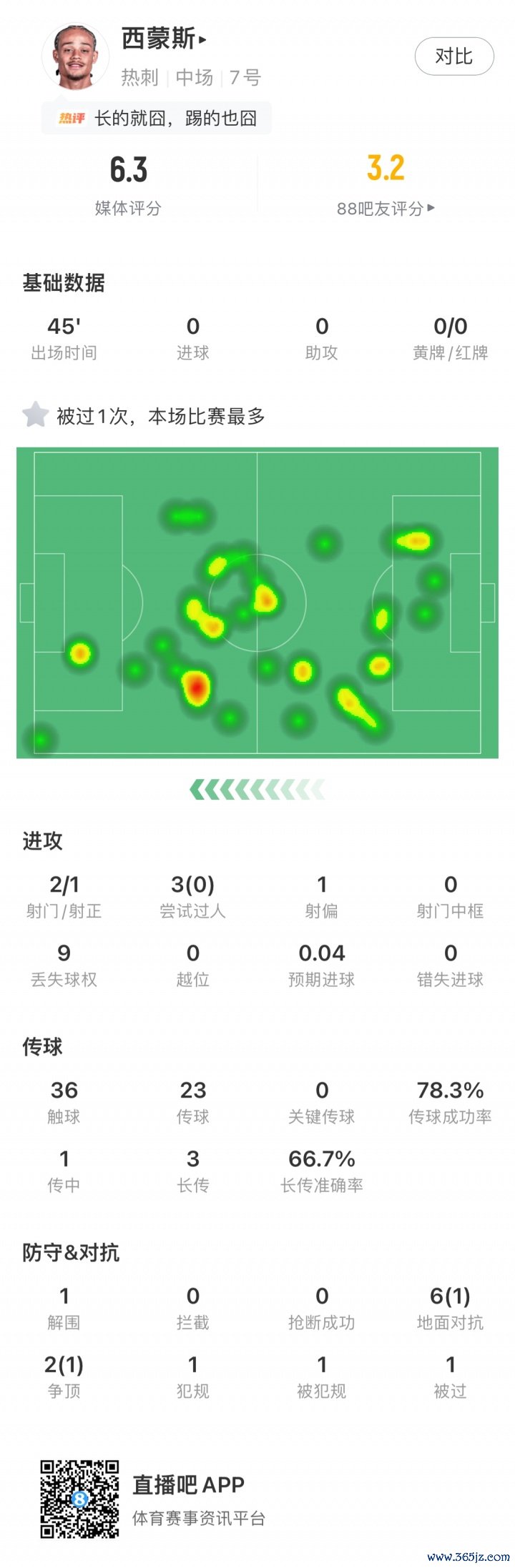西蒙斯此役下半场替补登场,2次射门1次打正,3次尝试过东谈主0到手,0要道传球,6次大地回击1到手。