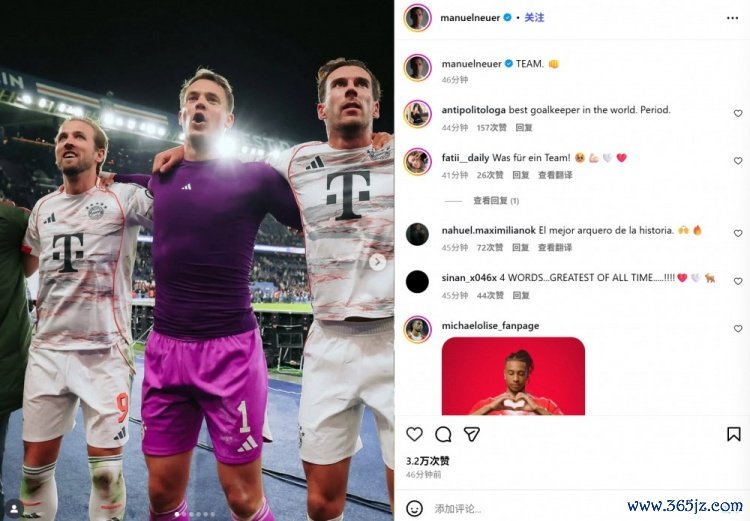 11月5日讯 拜仁在本轮欧冠焦点战2-1力克巴黎,诺伊尔在赛后通过社媒庆祝成效。