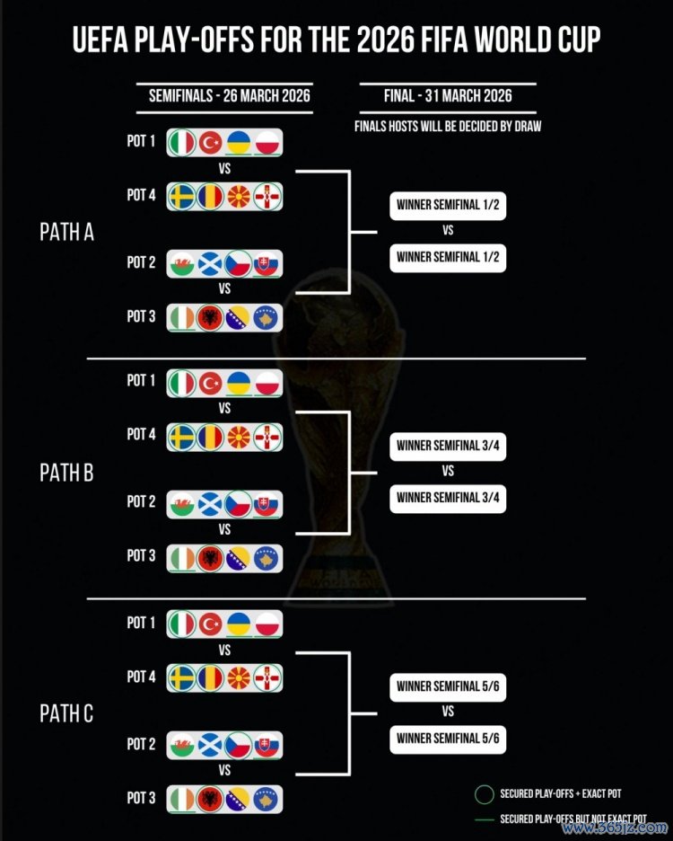 11月18日讯 多场世初赛欧洲区终末一轮比赛战罢,Football Rankings凭据现时地方瞻望了附加赛球队分档情况,