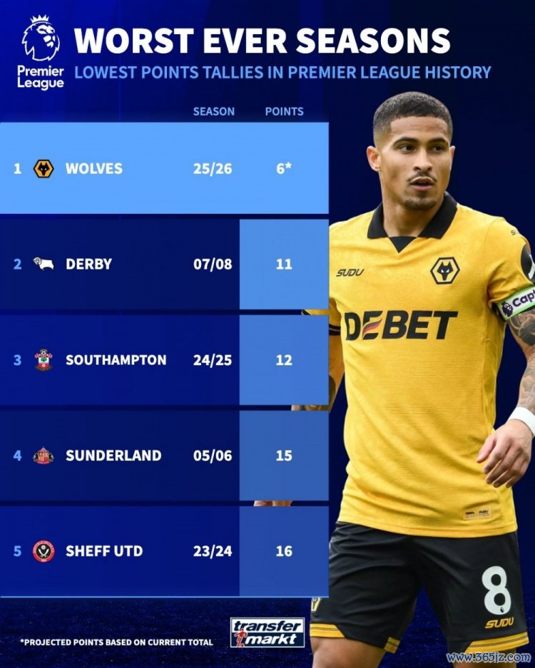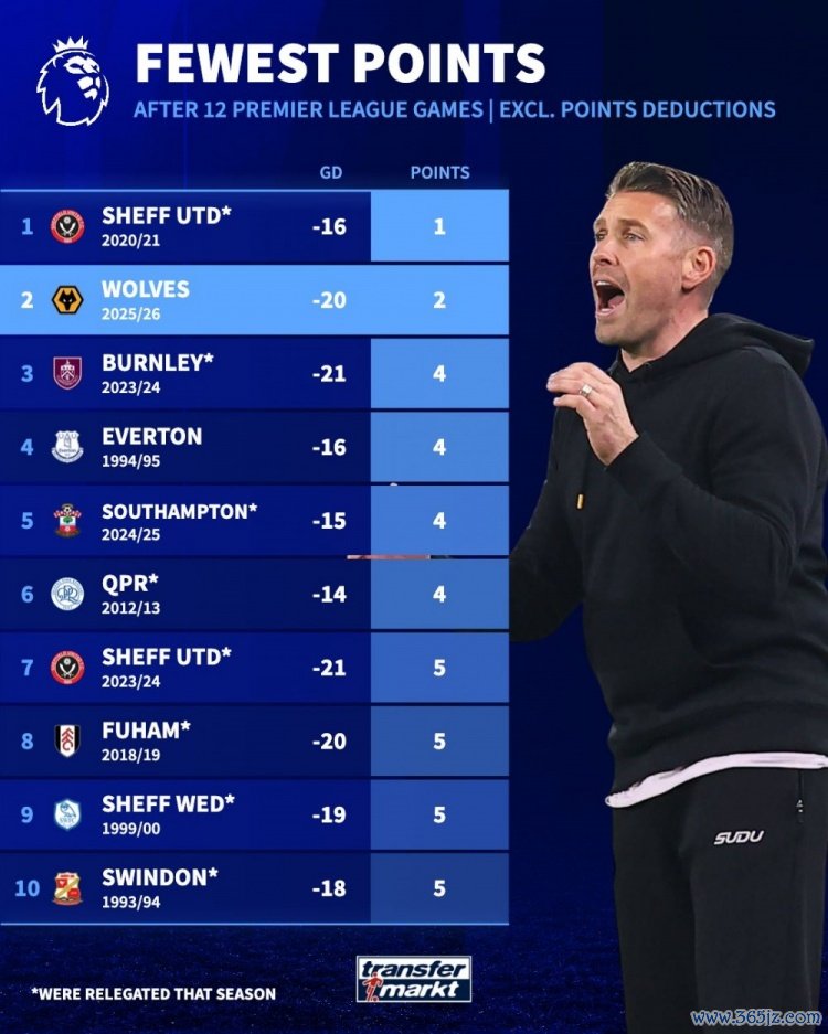 11月26日讯 狼队在本赛季推崇低迷,12轮后仅积2分,《转会市集》统计浮现他们亦然英超历史同时战绩倒数第二。