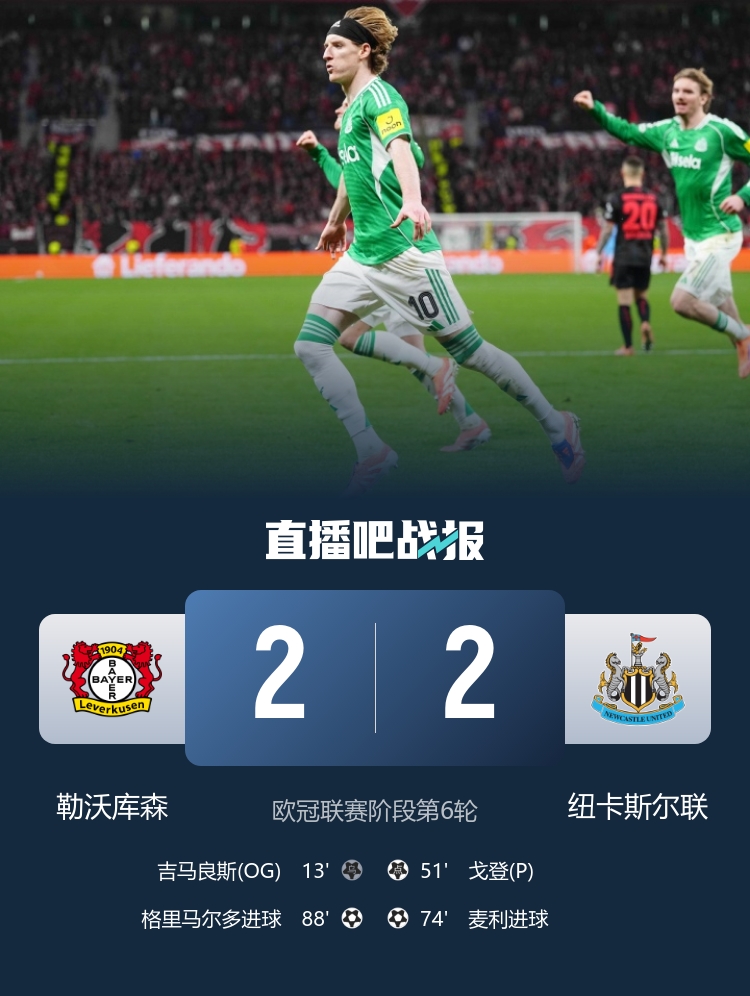 纽卡客场2-2勒沃库森