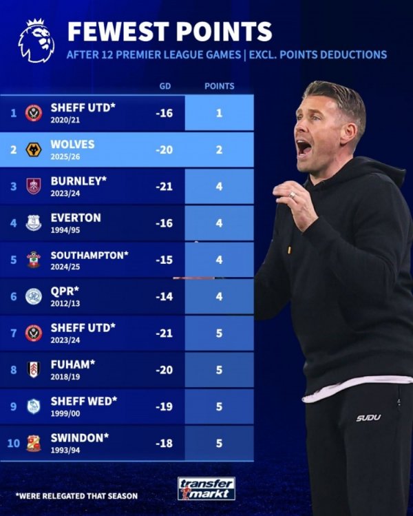 11月26日讯 狼队在本赛季推崇低迷,12轮后仅积2分,《转会市集》统计浮现他们亦然英超历史同时战绩倒数第二。 英超历史前12轮最低积分榜(不探讨罚分,带*号为当赛季左迁): 1.谢菲尔德联* (2020/21赛季),-16净胜球,1分 2.狼队 (2025/26赛季),-20净胜球,2分 3.伯恩利* (2023/24赛季),-21净胜球,4分 4.埃弗顿 (1994/95赛季),-16净胜球,4分 5.南安普顿* (2024/25赛季),-15净胜球,4分 6.女王公园巡......