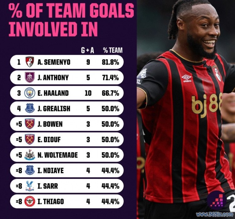 直播吧10月8日讯本赛季,伯恩茅斯边锋塞梅尼奥不竭了出色的情景,他在球队进犯中的要紧性显而易见。凭据OPTA的数据统计,塞梅尼奥参与进球数占球队总进球数的81.8%,为英超球员最高。