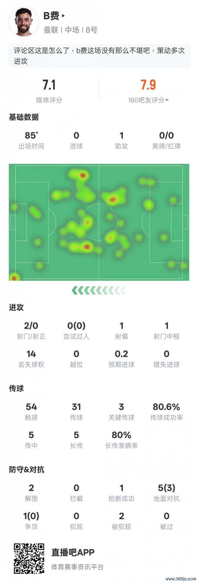 B费本场数据:1助攻3要害传球1掷中门框2突围,评分7.1