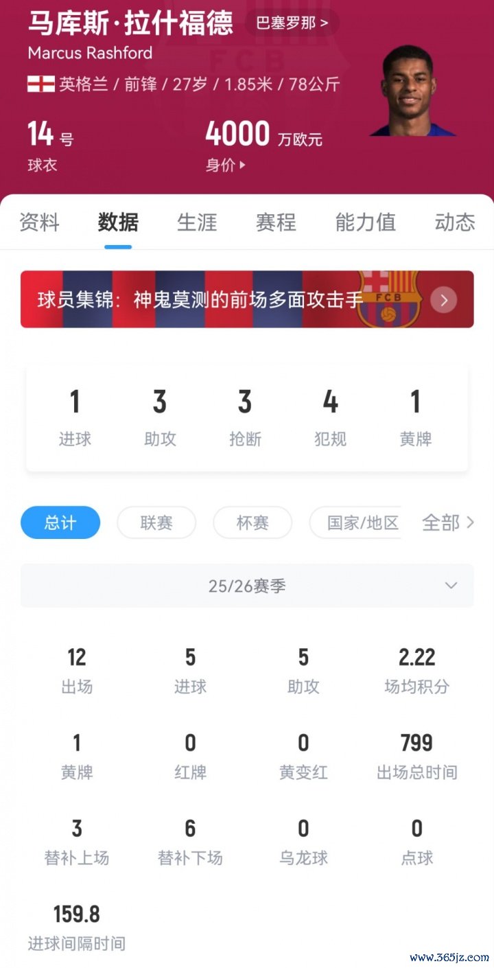 本赛季,拉什福德为巴萨在西甲+欧冠赛场还是出场12次,孝顺5球5助。