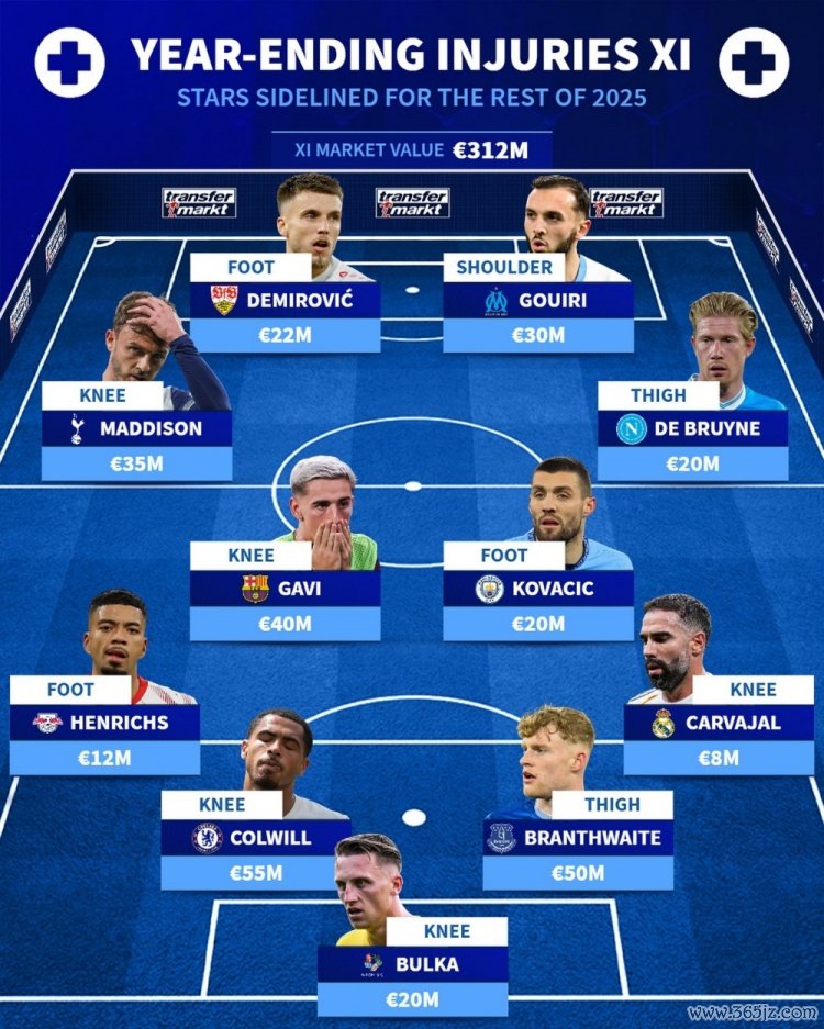 11月4日讯 德国转会市集列出了因伤缺席本年剩余比赛球员声势,德布劳内、加维、卡瓦哈尔在列。