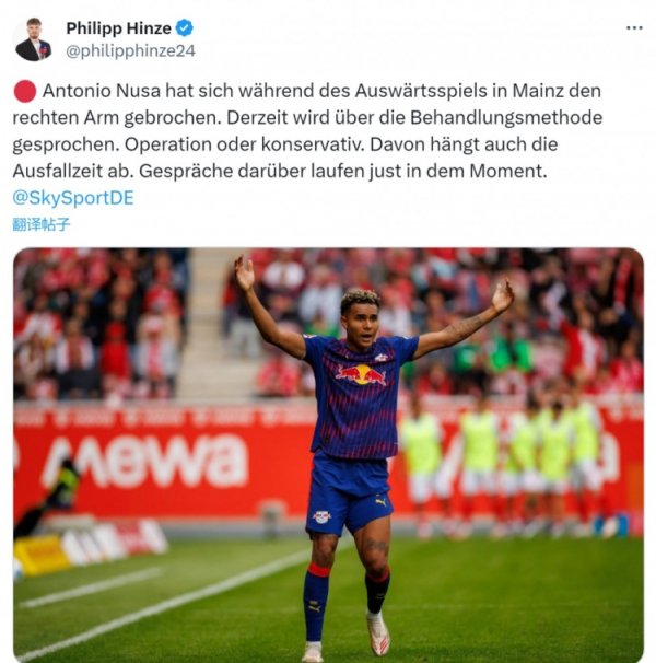 9月15日讯 据记者Philipp Hinze报说念,莱比锡边锋努萨右臂骨折。 Philipp Hinze败露,努萨在对阵好意思因茨的比赛中右臂骨折,现在正在征询诊疗决策,是聘任手术仍是保守诊疗,这也将决定他的缺席技能。 努萨现年20岁,上赛季为莱比锡出战36场比赛,打进5球,助攻7次。......