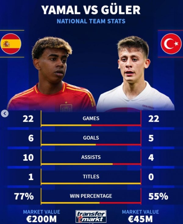9月8日讯 土耳其行将迎战西班牙,两队的年青中枢偶合来自皇马和巴萨。《转会阛阓》也对比了两东说念主的国度队要津数据。 亚马尔(西班牙,18岁,身价2亿,2023年国度队首秀):22场,6球10助攻,1冠军,胜率77% 居勒尔(土耳其,20岁,身价4500万,2022年国度队首秀):22场,5球4助攻,0冠军,胜率55%......