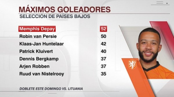 9月8日讯 荷兰在本轮世初赛3-2力克立陶宛,德佩梅开二度,并登顶荷兰队史弓手王。 数据统计知道,他亦然荷兰队史进球榜前七中独一的现役球员。 荷兰队史弓手榜: 德佩,52球 范佩西,50球 亨特拉尔,42球 克鲁伊维特,40球 博格坎普,37球 罗本,37球 范尼,35球......