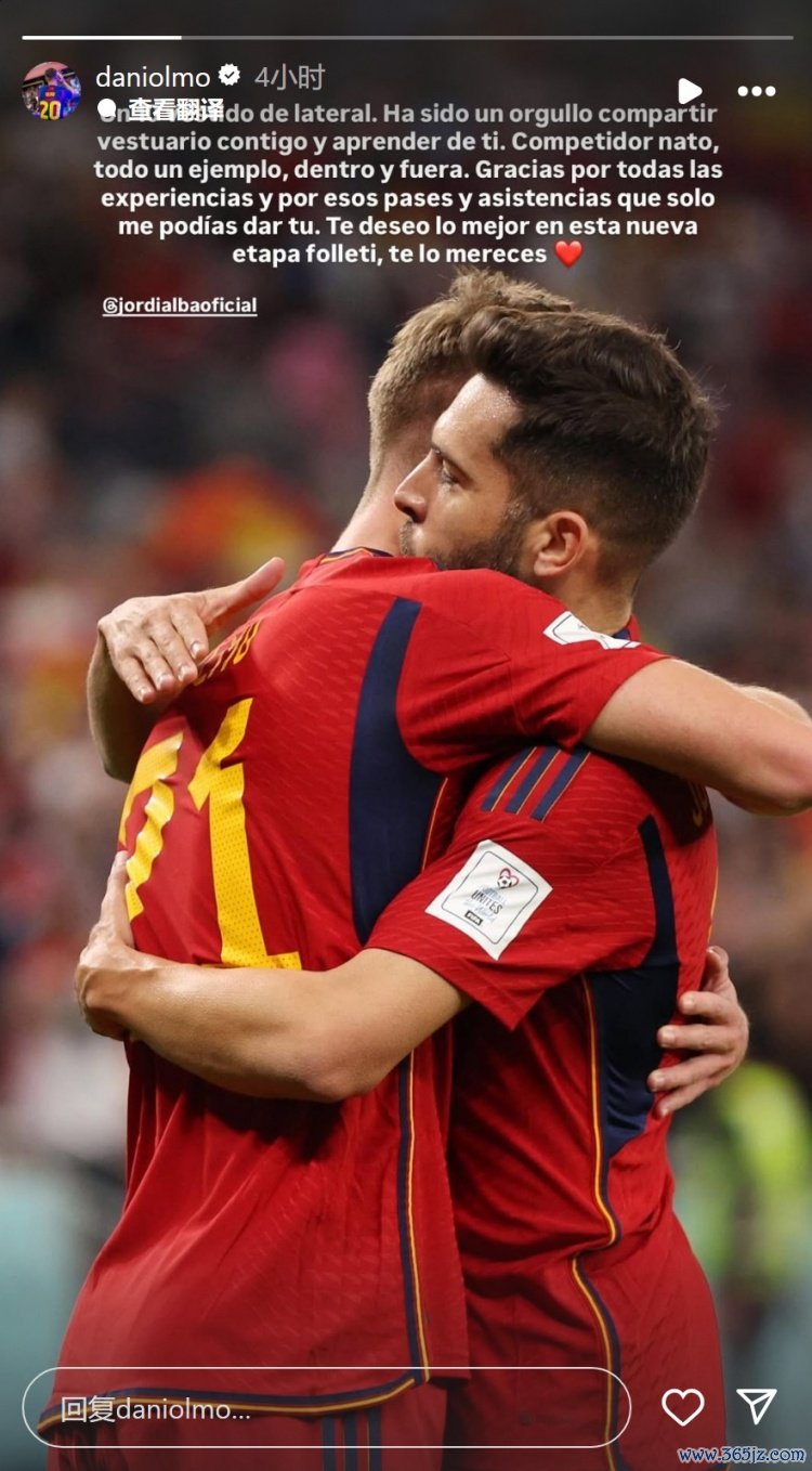 奥尔莫社媒晒出与阿尔巴在西班牙队的合照,配文:“一位10号边后卫。能与你共用更衣室并向你学习,我深感红运。天生的竞争者,场上场下都是楷模。”