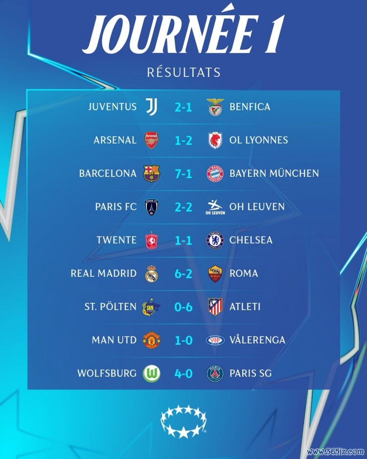 10月9日讯 女足欧冠联赛阶段首轮比赛战罢,巴萨7-1拜仁,阿森纳1-2里昂,皇马6-2罗马,尤文、曼联齐取胜。
