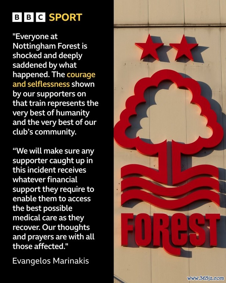 俱乐部雇主马里纳基斯示意:“诺丁汉丛林举座成员对发生的悲催感到胆怯和深远缅怀。咱们的复古者在列车上展现的勇气和忘我,体现了最好意思妙的东谈主性色泽和最可贵的俱乐部社区精神。”