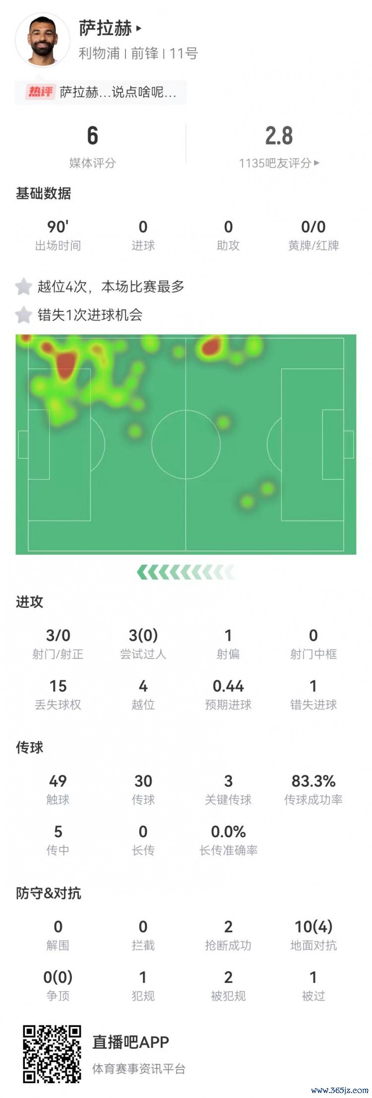萨拉赫本场3射0正+1失良机 3过东说念主0告捷 3要津传球+4越位 获评6分