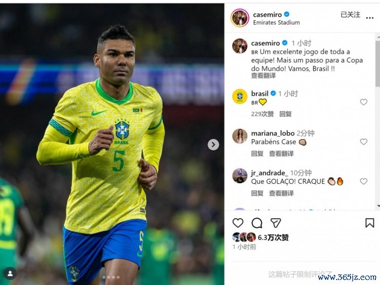 卡塞米罗社媒晒出比赛相片,写谈:“全队齐弘扬出色,向宇宙杯又迈进一步!加油巴西!”