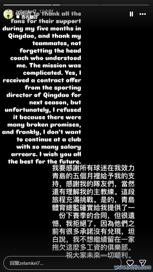 他写说念:“我要感谢青岛悉数球迷在五个月予以我的撑执,感谢我的队友们,虽然还有厚实我的主锻练。这段旅程充满挑战。是的,青岛体育总监照实给我提供了一份下赛季的公约,但很缺憾,我终止了,因为他们之前有好多容或莫得竣事,率直说,我不念念不竭留在一家拖欠这样多工资的俱乐部。祝民众过去一切奏凯。”