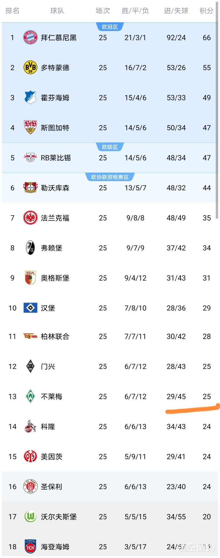 今天凌晨,德甲第25轮结束了最后2场较量,法兰克福、不莱梅等队出战,这两场较量之后,德甲所有战队都已经踢完了第25轮的赛事,德甲联赛足球球队排名榜发生变化,我们来看看。