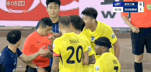 第90+5分钟,三镇球员投诉姜至鹏禁区内手球犯规,裁判莫得暗示