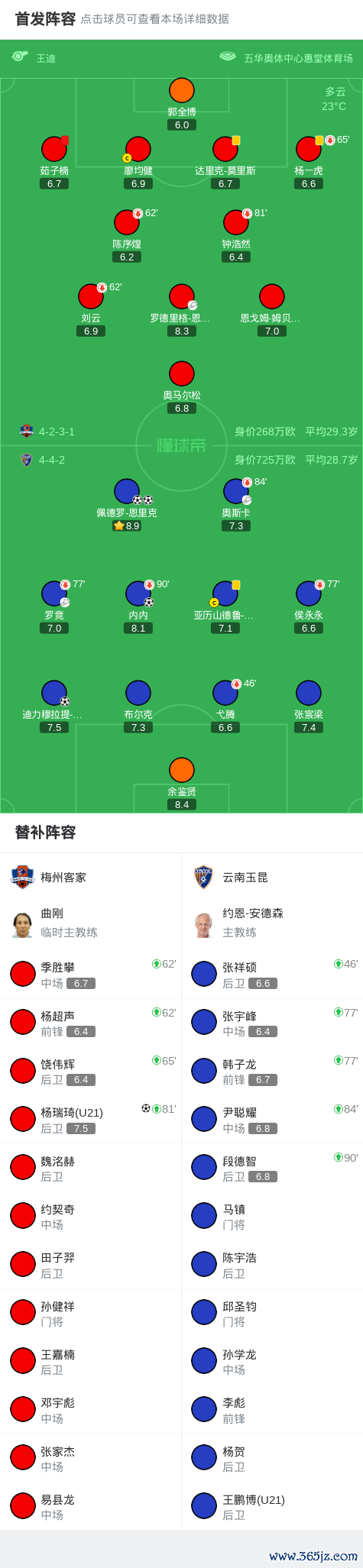 第64分钟,罗竞助攻,内内凌空抽射破门,云南2-0梅州