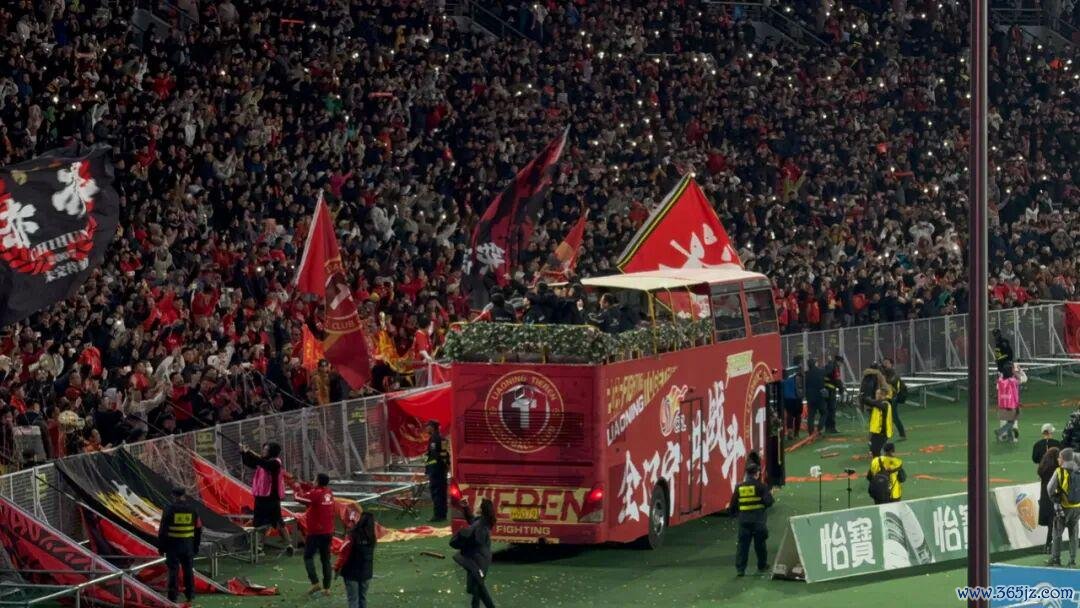 冲超当晚,铁东谈主全队在花车上与球迷互动