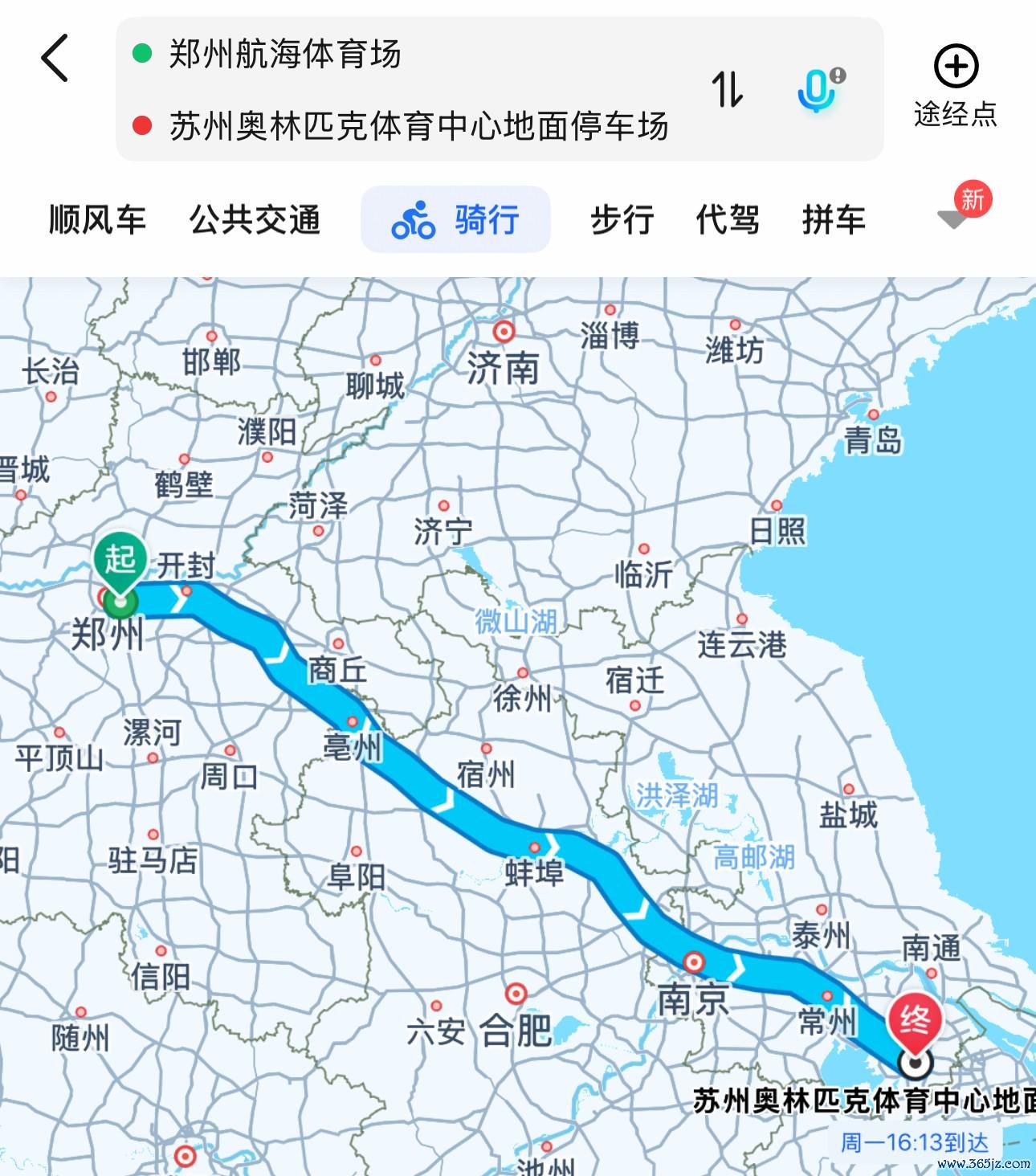 舆图软件APP搜索线路,郑州帆海带领场骑行到苏州奥体中心的距离约858公里。